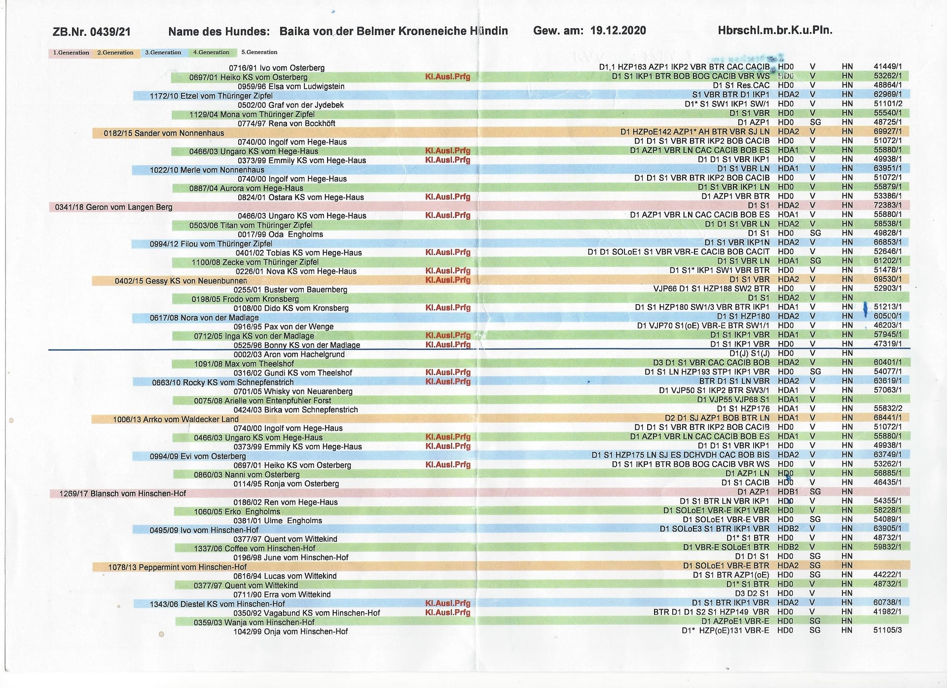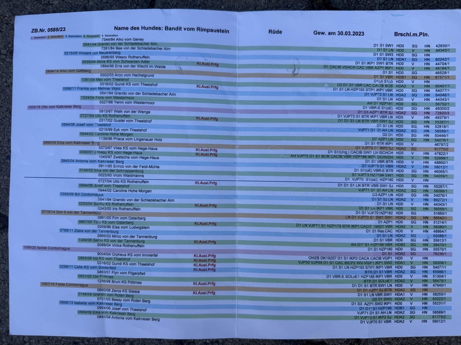 D1 (4h Vorstehen), S1 (4h Vorstehen), VGP1 (349 Pkt. Totverbeller), sichtlaut, Saujager, BTR, HN, HD A2, OCD-frei